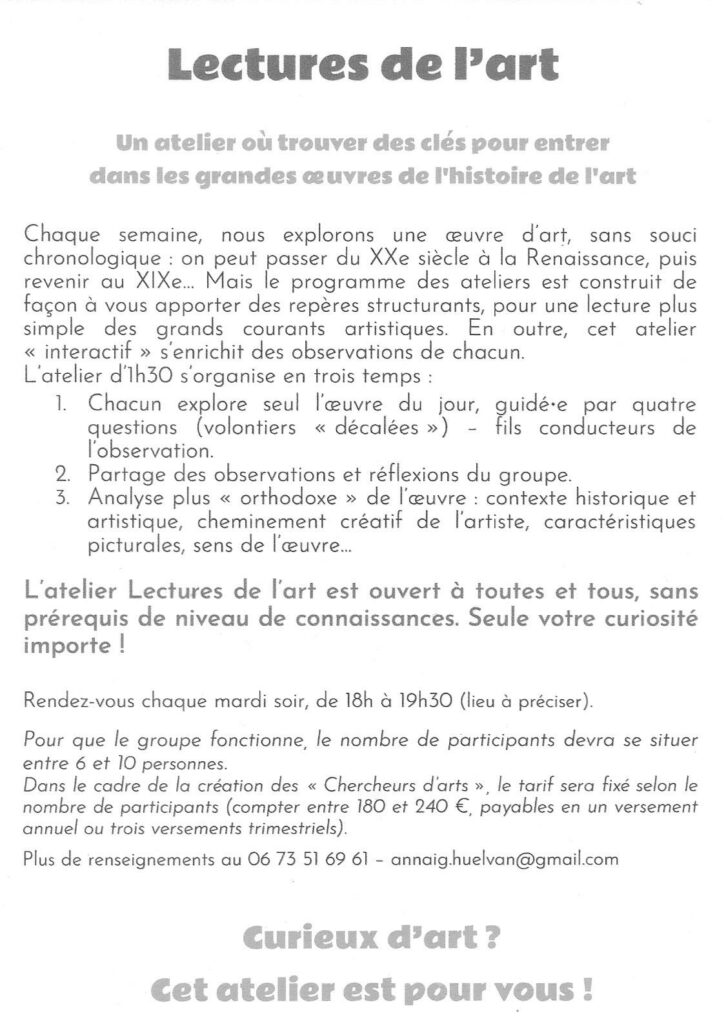Pour tous les curieux de peinture et sans prérequis quant à votre niveau de connaissances, cet atelier vous permettra de plonger dans une série d’œuvres mettant en scène villes et campagnes. Ensemble, nous mettrons en lumière les liens qui les relient – ce que l’on pourrait appeler histoire de l’art ! Seuls outils nécessaires : vos yeux pour regarder et un stylo pour laisser galoper votre esprit !